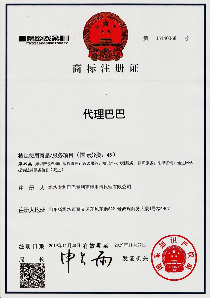 2019年11月28日,潍坊专利巴巴专利商标申请代理有限公司申请的代理巴巴商标获得国家商标局注册公告,注册公告期号为:第1673期。