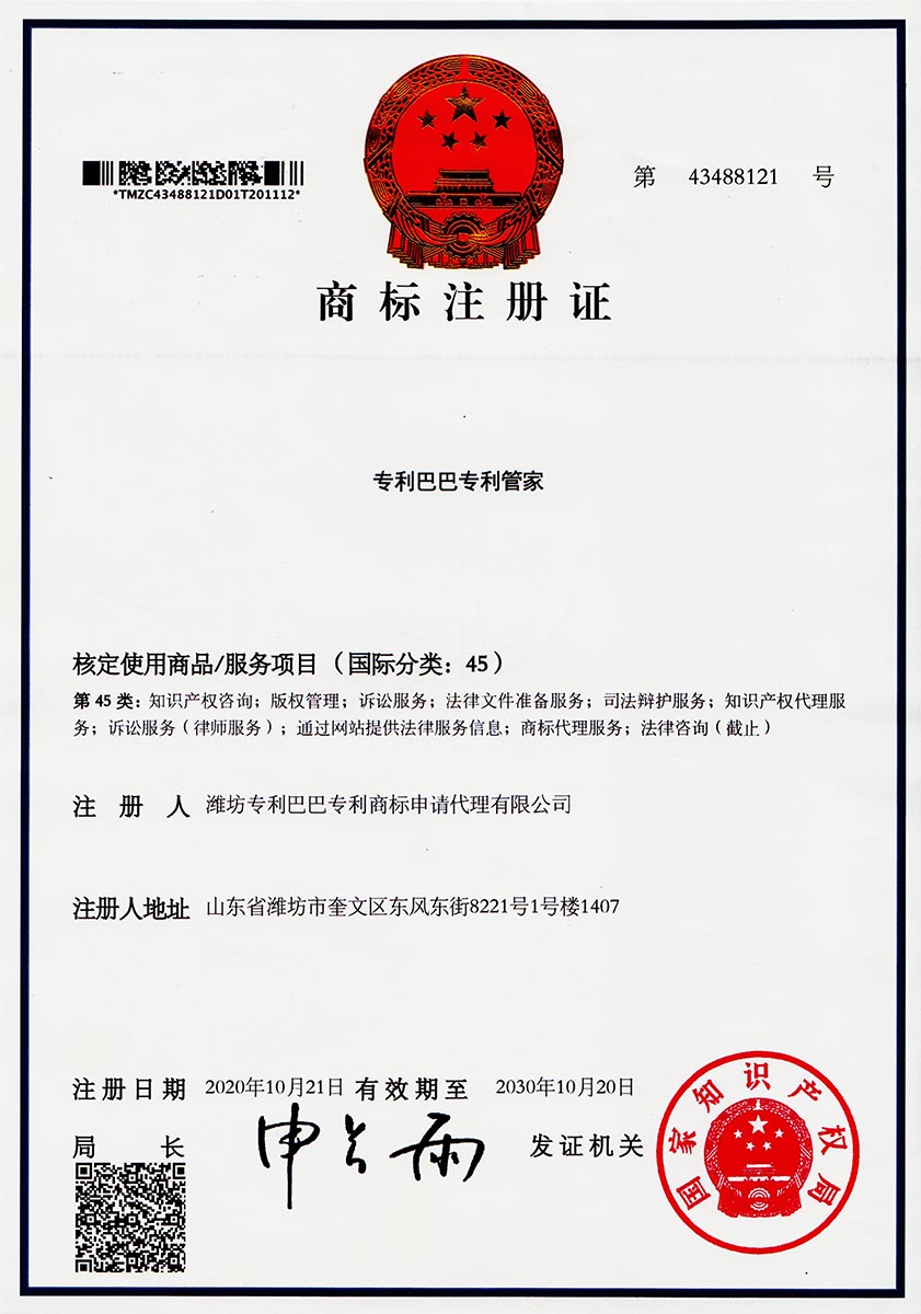2015年5月21日,刘伟华先生以潍坊专利巴巴专利商标申请代理有限公司名义提交了“专利巴巴网”商标注册申请,商标申请号是:17006705。“专利巴巴网”品牌商标的专用权期限是2016年11月21日 至 2026年11月20日。