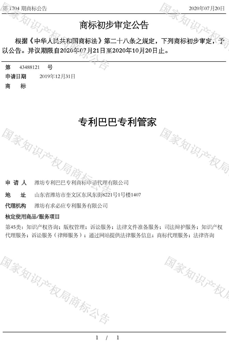 2020年07月20日,专利巴巴专利管家商标获得初审公告。